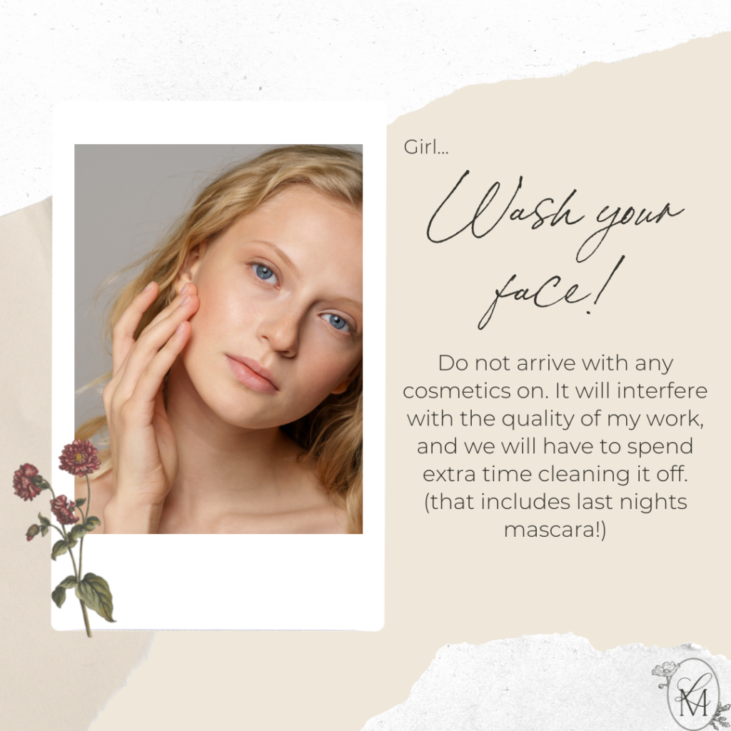 While that may seem self-explanatory, it isn’t always the case. Please DO NOT arrive to your preview with any makeup on of any kind at all! I will have to take it off anyway, and won’t be able to cleanse your skin for a perfect canvas like I would prefer. This is the most important item on my list.